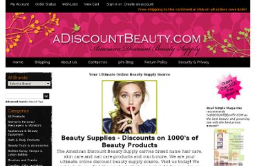 The American Discount Beauty Supply carries brand name hair care, skin care and nail care products and much more. We are your ultimate online discount beauty supply source. Visit us today! We want to help you find the products that are just right for you. Are you high maintenance, or a shake it and go type of person? Do you spend one hour, or one minute getting ready in the morning? No matter what your needs are...we have it here! We offer over 6000 top beauty products, all at great discounted prices...up to 40% off retail! Best of all, we have been in the Beauty Business for over 30 years and we are always ready to serve you. If your looking for great Discount Beauty Supplies, look no further!